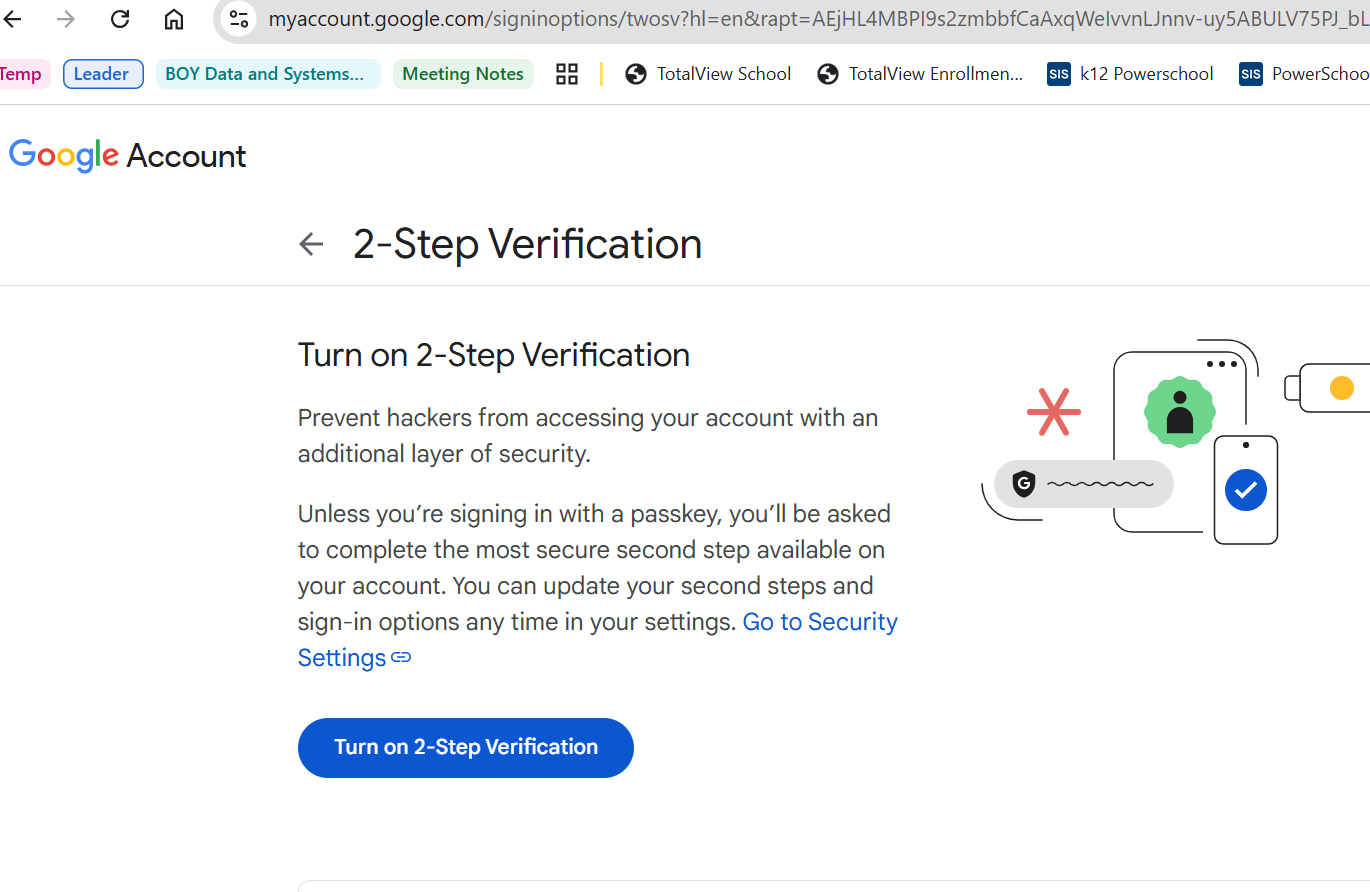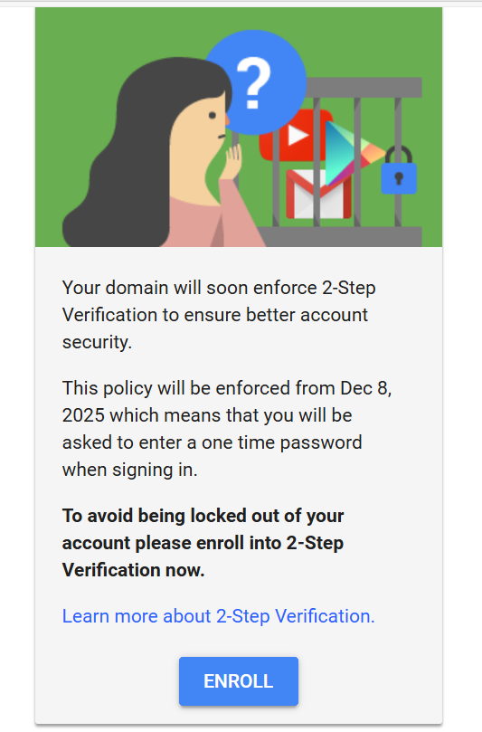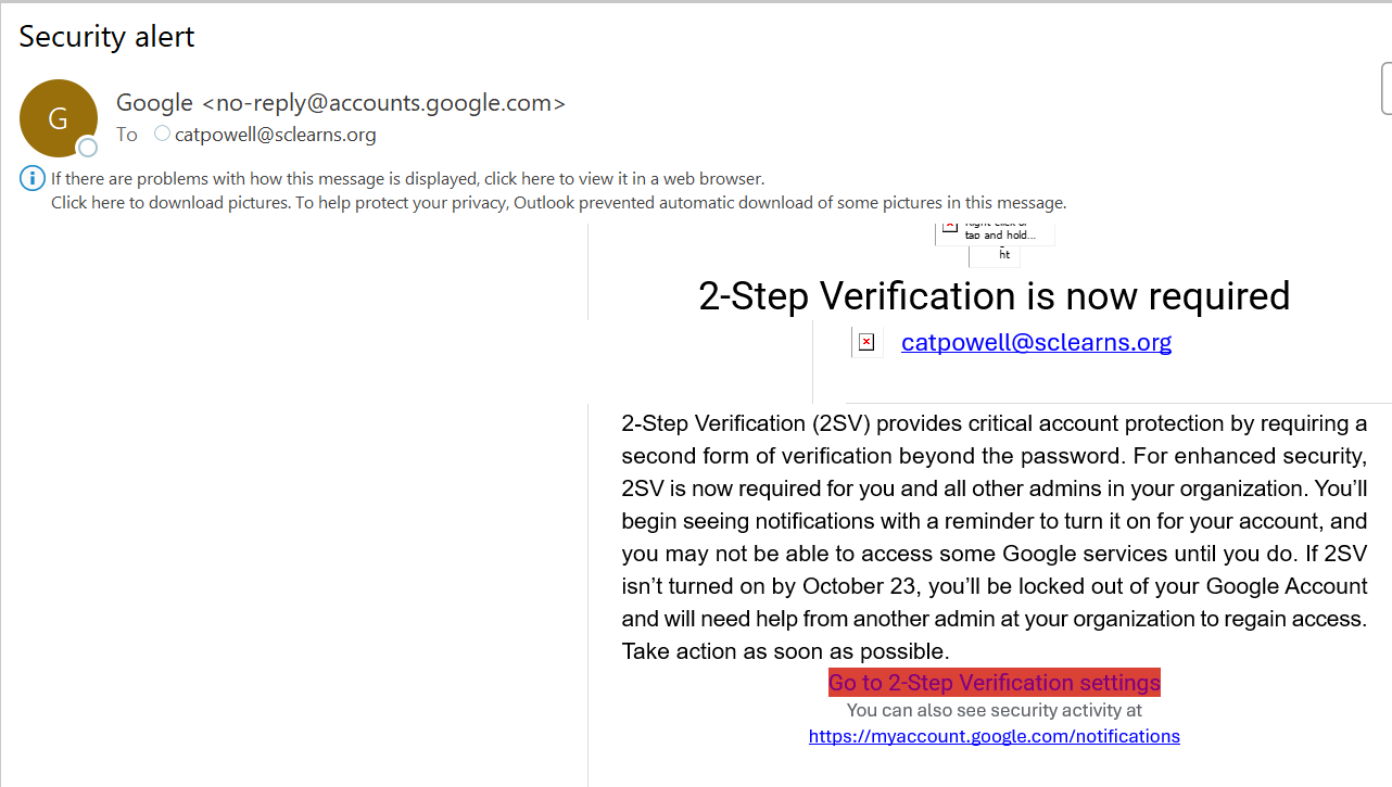 2-Step Verification (2SV) provides critical account protection by requiring a second form of verification beyond the password. For enhanced security, 2SV is now required for you and all other admins in your organization. Youâll begin seeing notifications with a reminder to turn it on for your account, and you may not be able to access some Google services until you do. If 2SV isnât turned on by October 23, youâll be locked out of your Google Account and will need help from another admin at your organization to regain access. Take action as soon as possible.
